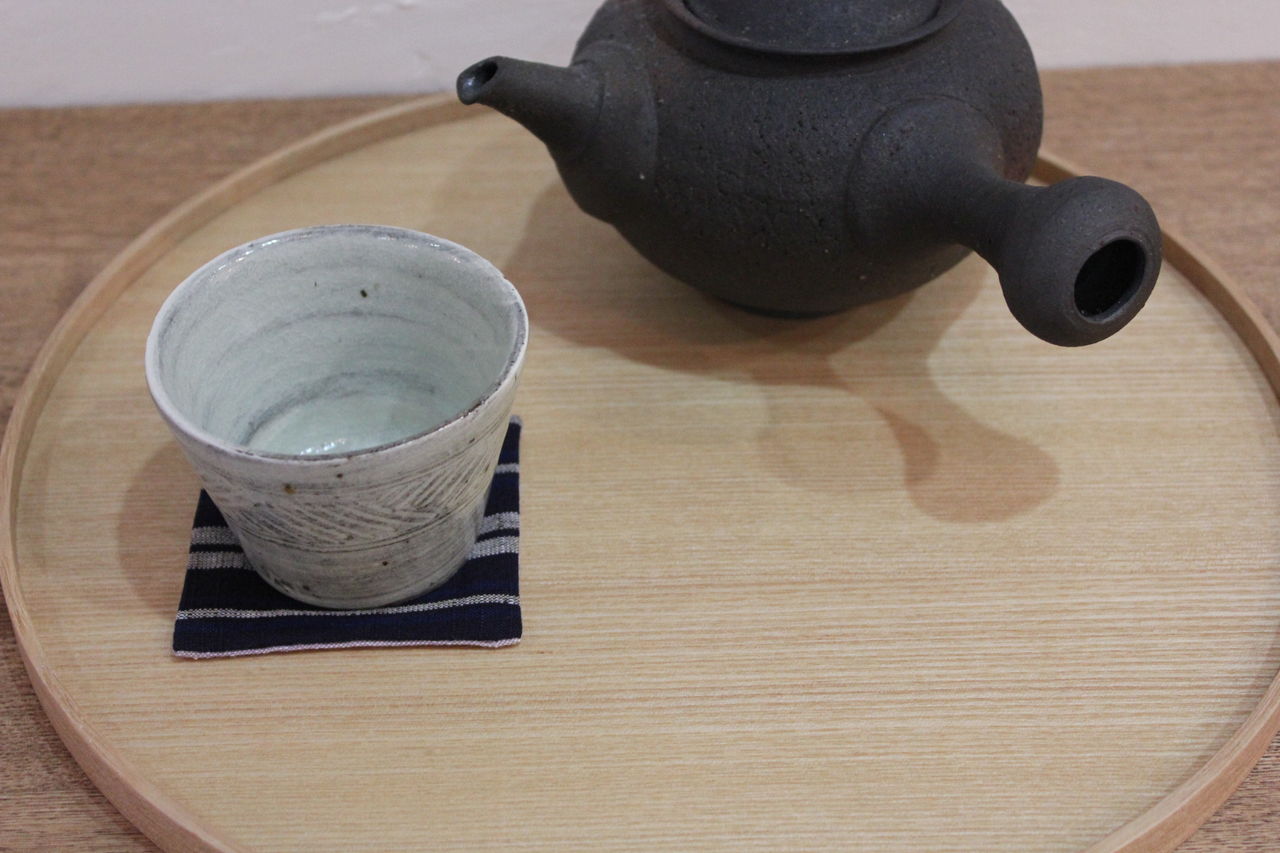 田尾明子さんの焼締の渋い急須に、川口武亮さんの三島のそばちょことヤンマの会津木綿コースター。とても良い感じ。