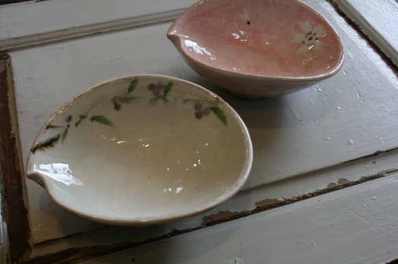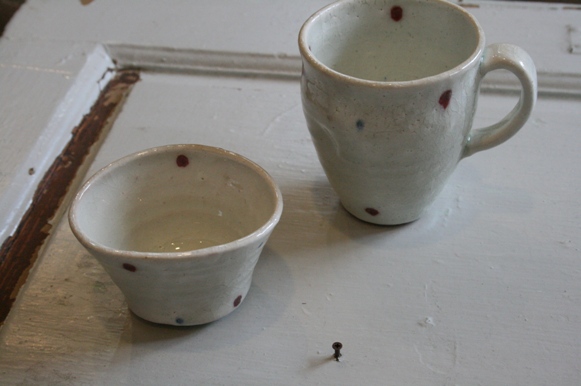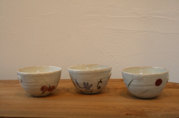 柄は可愛らしくも生地に緋色が見えたり、粉引きの貫入がかっこよかったりと
