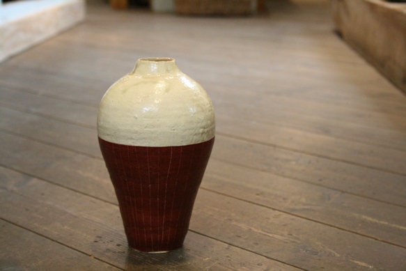 赤巻に粉引きのツートンで、ストライプの引っかき模様がアクセント。