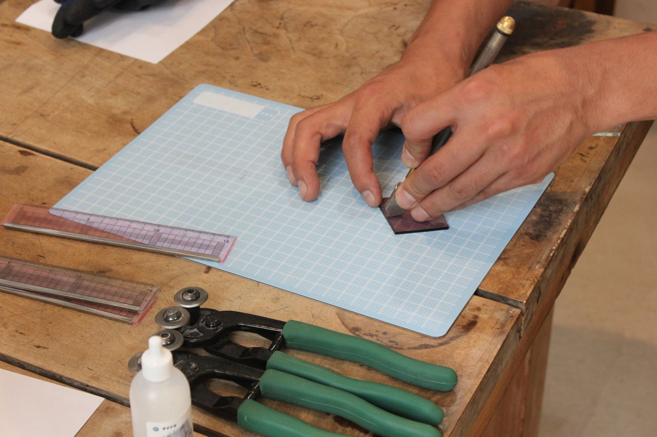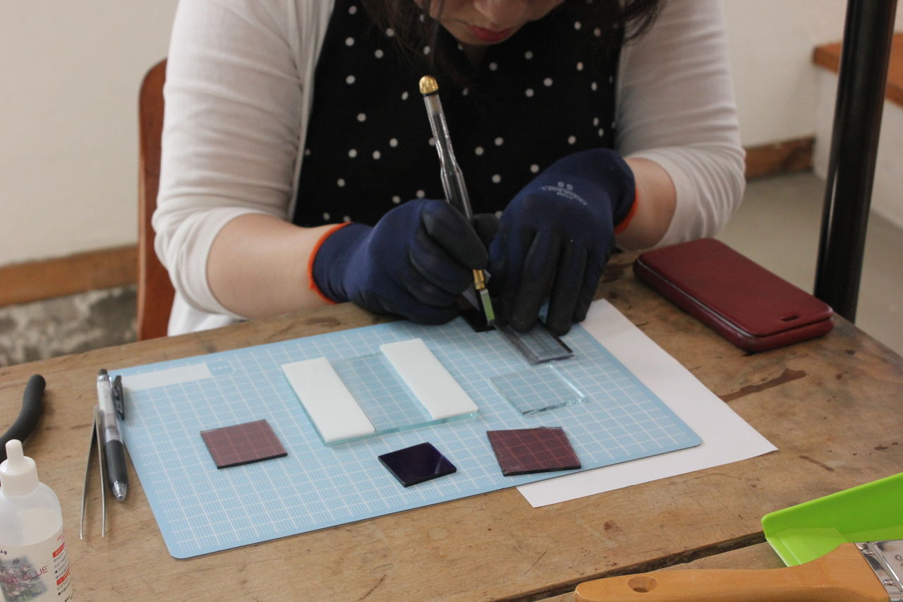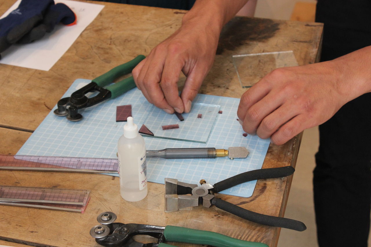 象嵌のように凹の部分に色の付いたガラスを埋めていく作り方で、