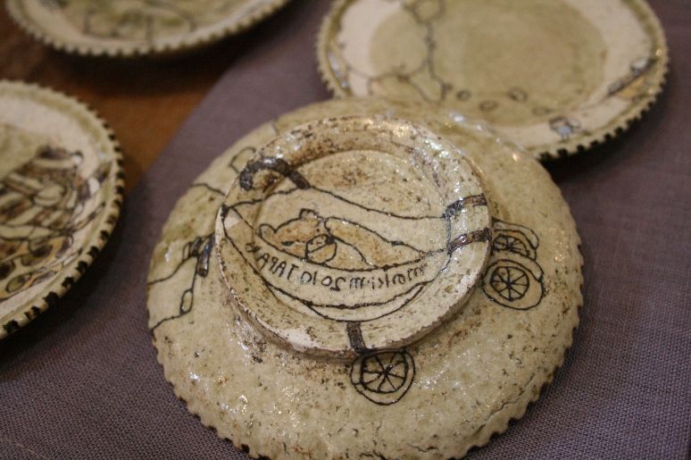 縁取りの黒い線はイッチン(絞り出し)で描かれています!しかも一点づつ全然絵が違いながら、どこかにストーリーや世界観を感じる、とても素敵な器です。
