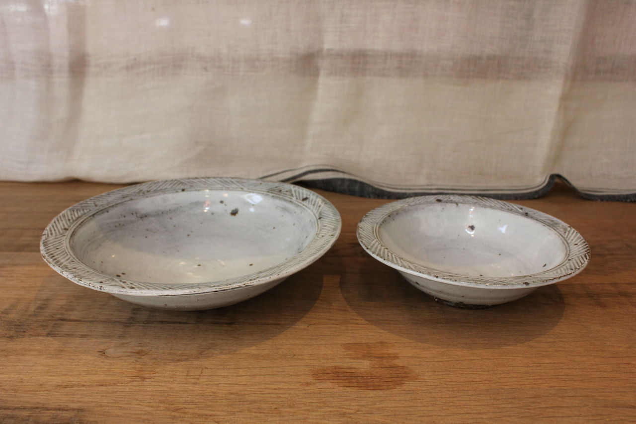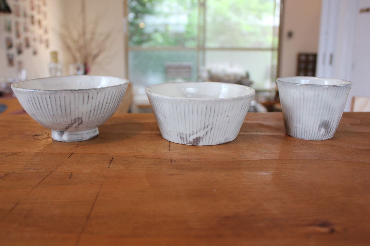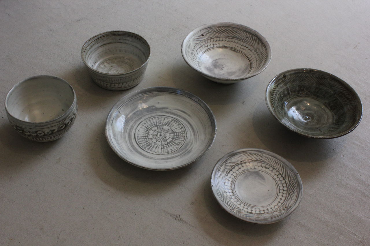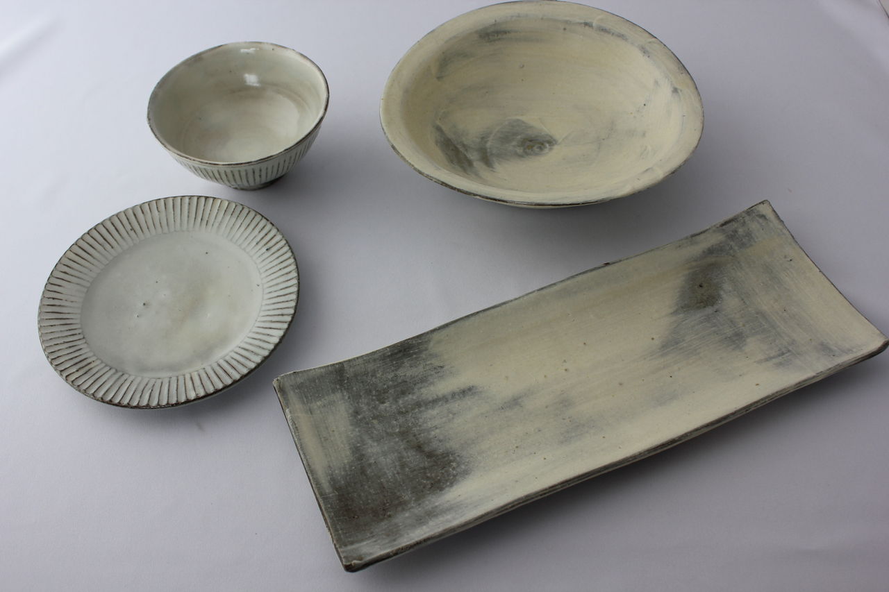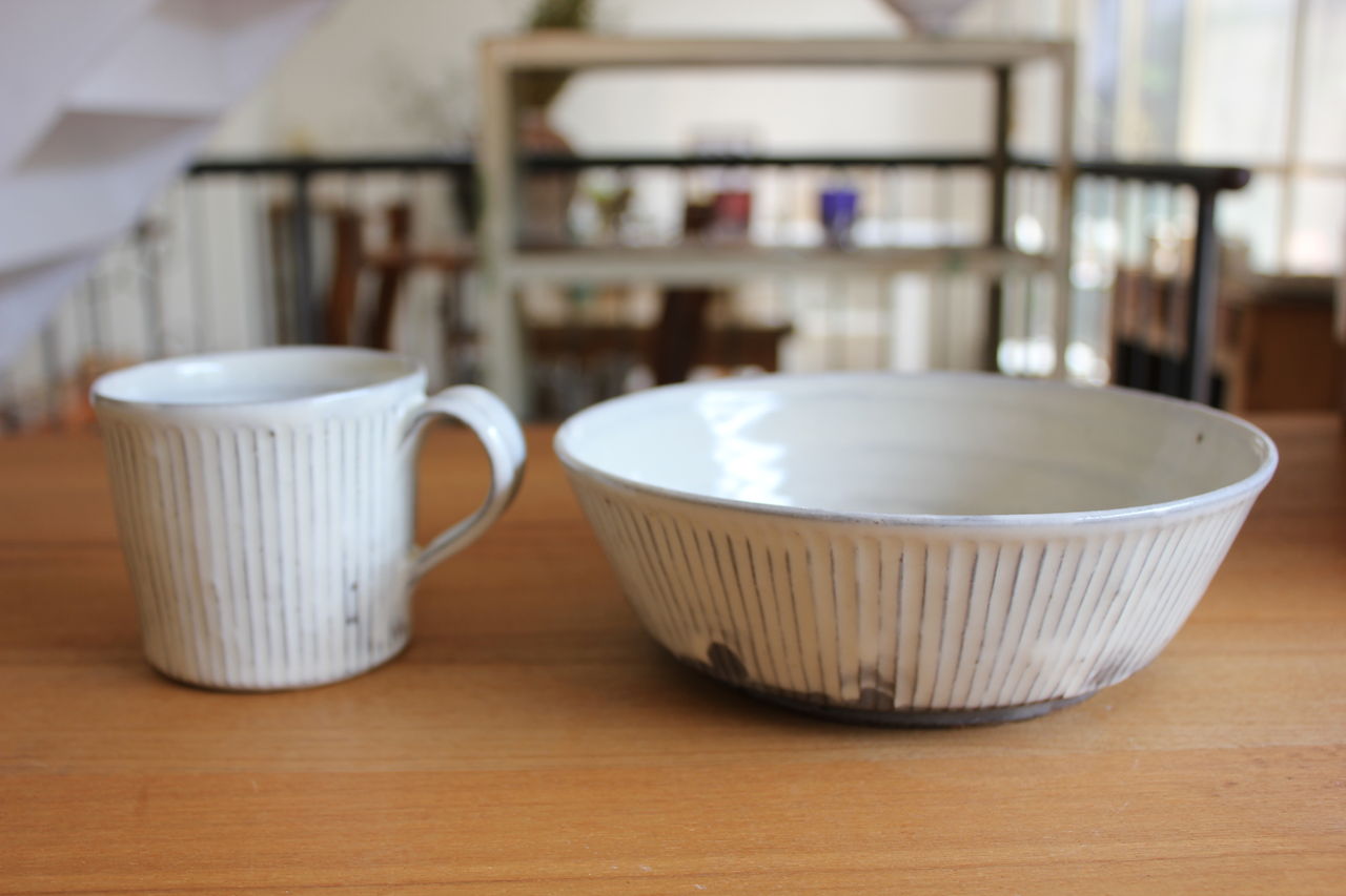 本日は彼の初期からの定番粉引しのぎと刷毛目の器をご紹介。