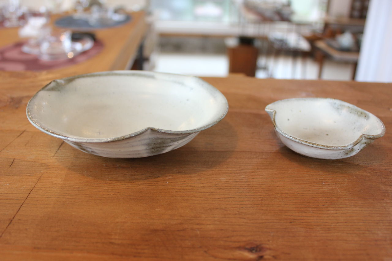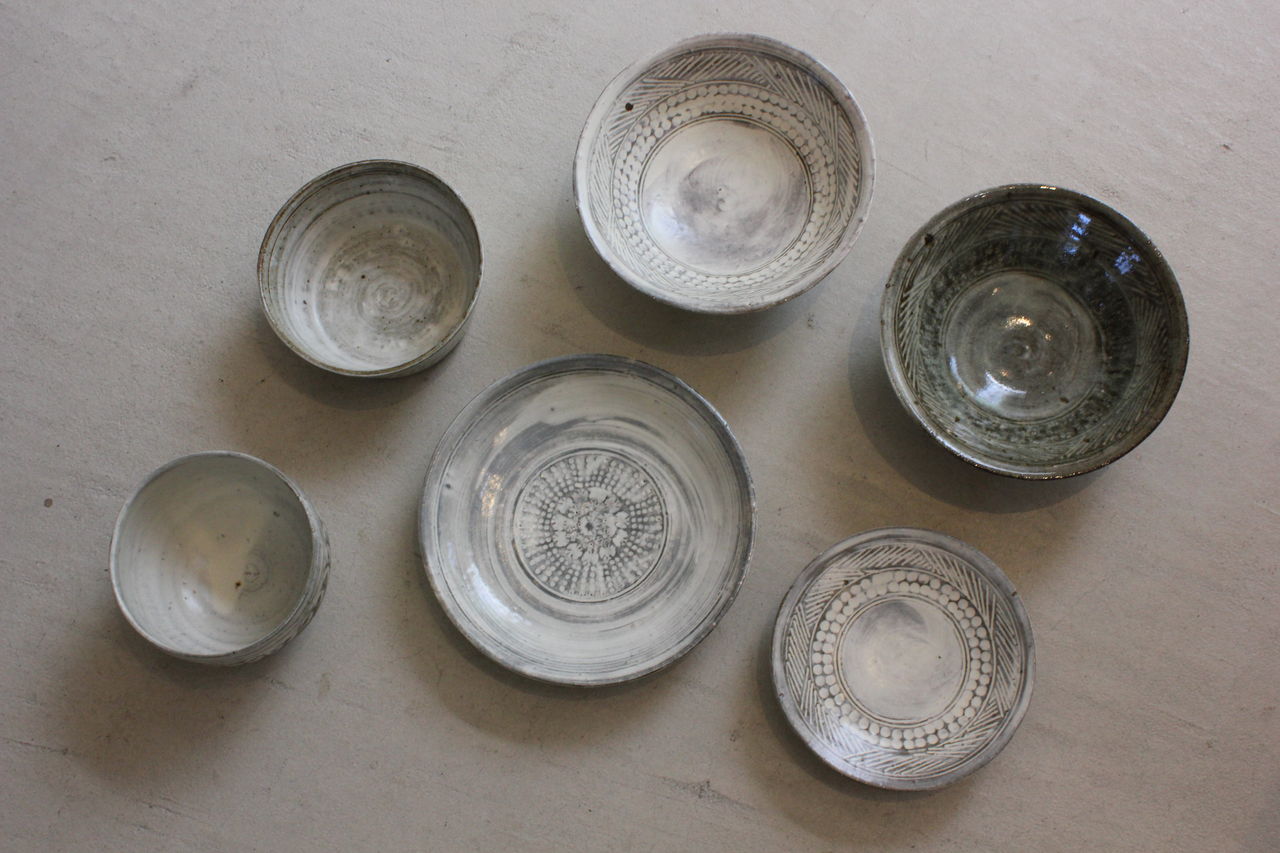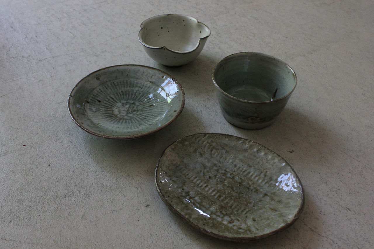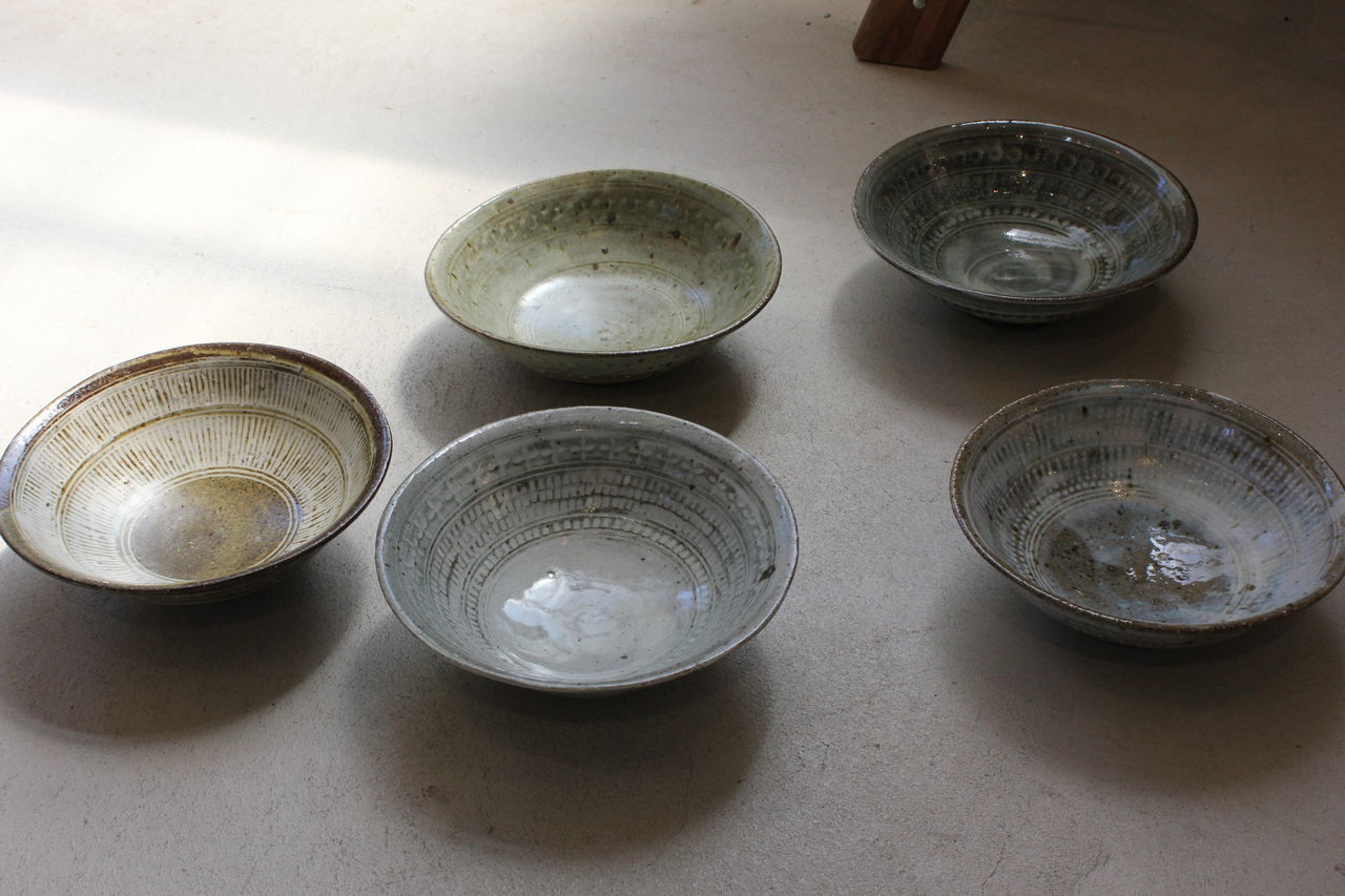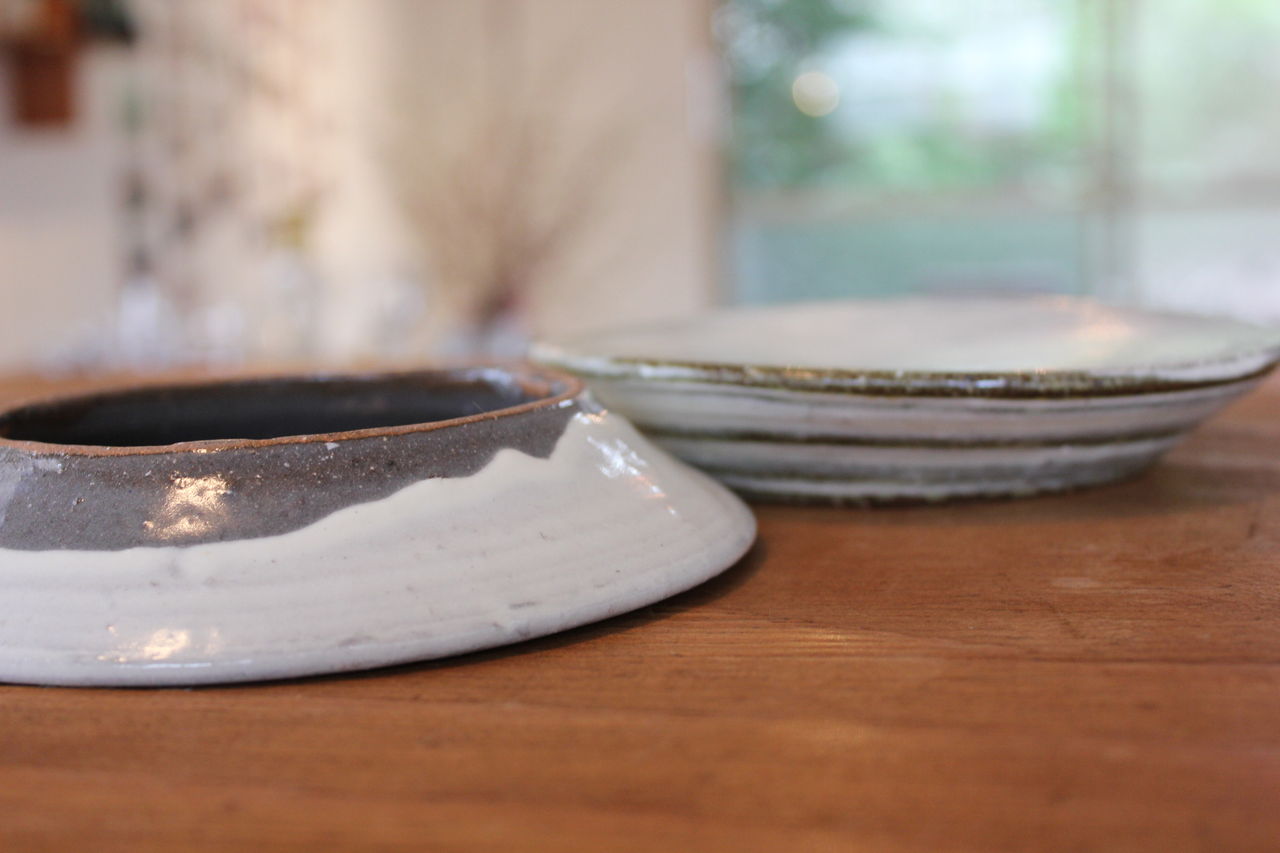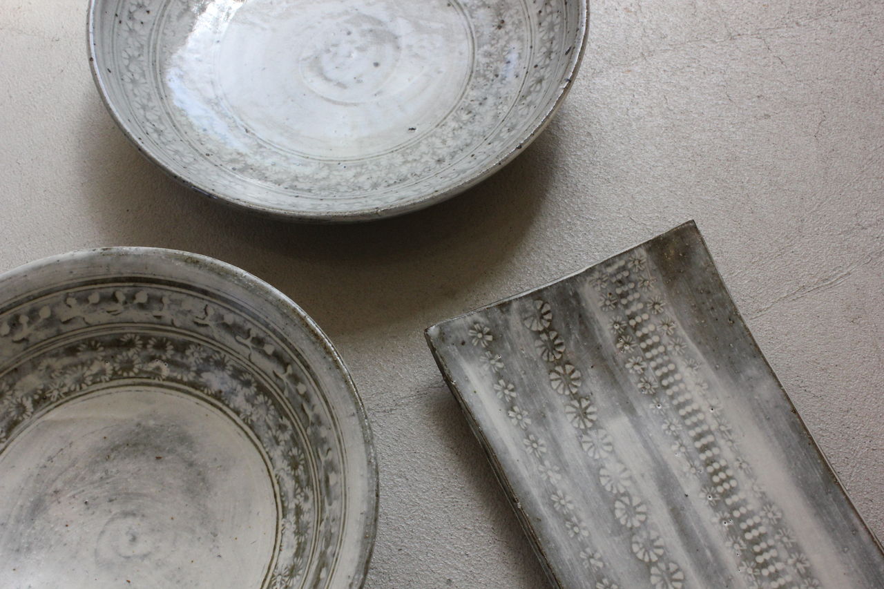本日は彼の初期からの定番粉引しのぎと刷毛目の器をご紹介。