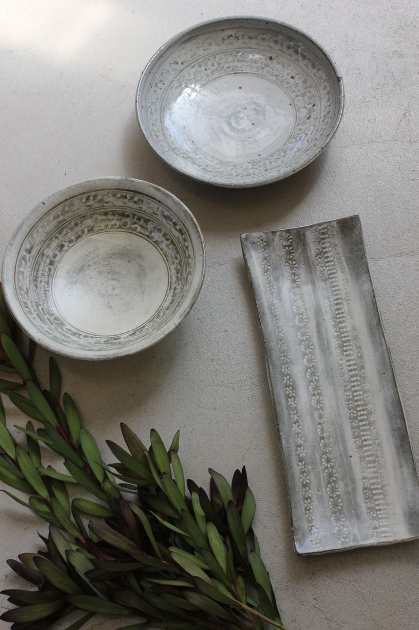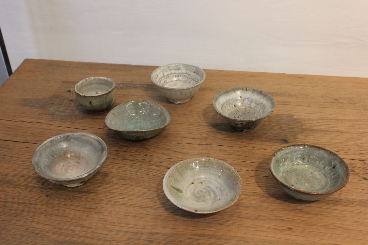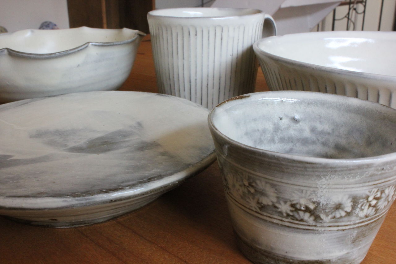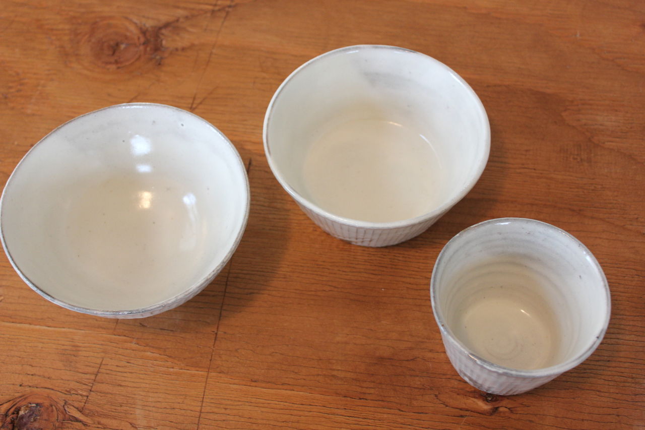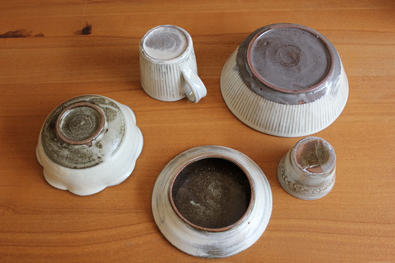 本日は彼の初期からの定番粉引しのぎと刷毛目の器をご紹介。