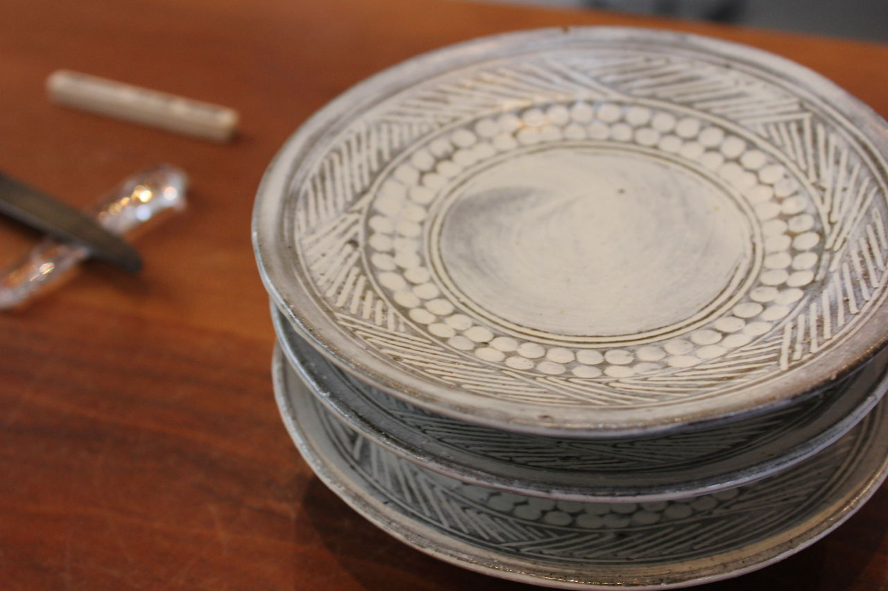 三島と呼ばれる印花文を施し、化粧土と釉薬で象嵌風に陰影をつけて魅せていきます。