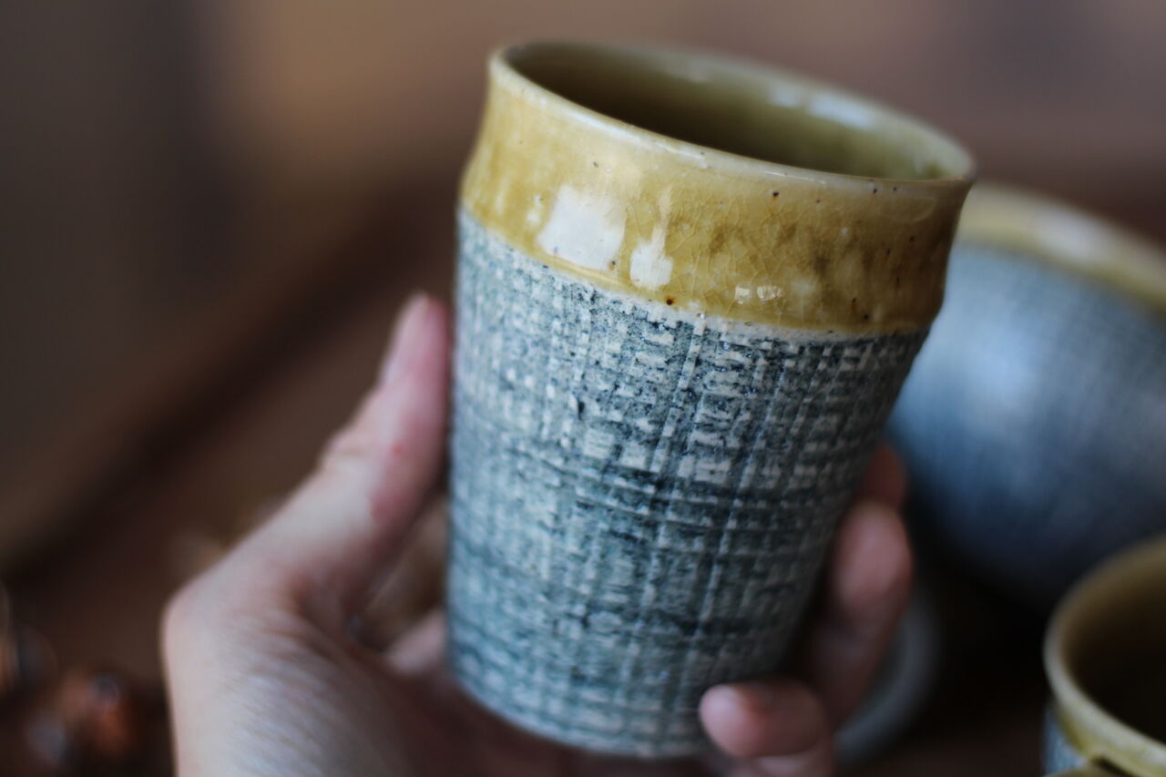 有冨さんよりブルーチェックにアンバーの釉薬の