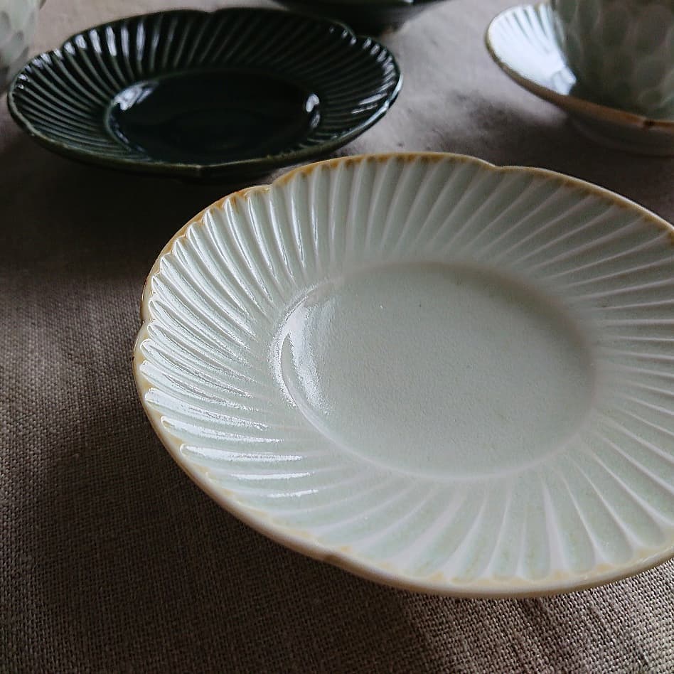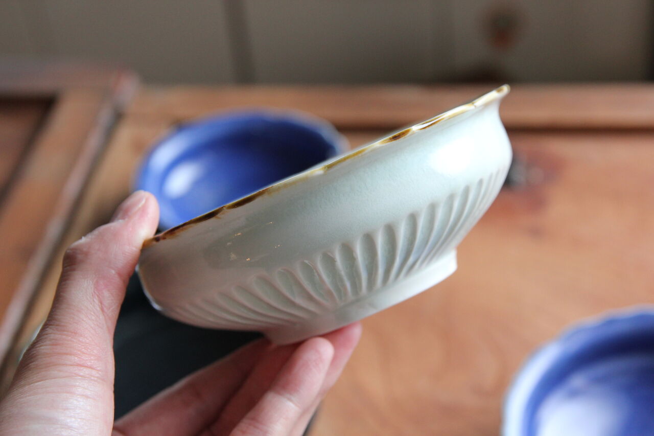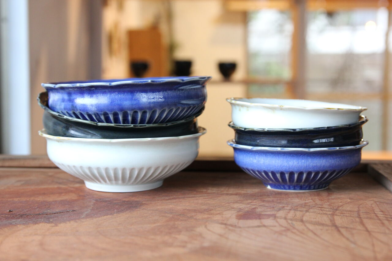 鎬稜花のリム鉢中は煮物鉢やお鍋の取り鉢に本当に使いやすい!!いい器です。小サイズは和え物や冷ややっこにぴったんこ!!変形皿はお醤油やたれ、手塩皿に菓子皿にと雰囲気あっていいお皿です。