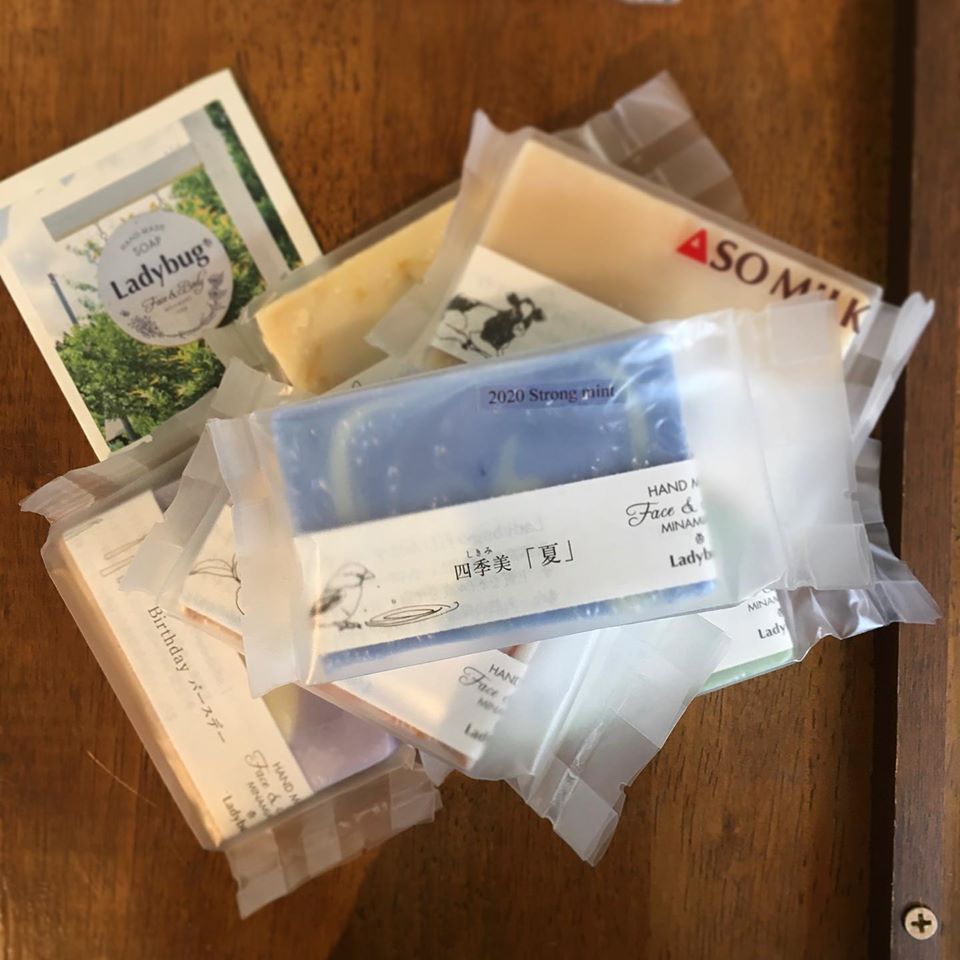 主宰のトヨダさんは所用で不在なのですが、阿蘇高森よりたくさんの石鹸と、それにまつわるオリジナルの商品が届いております😊