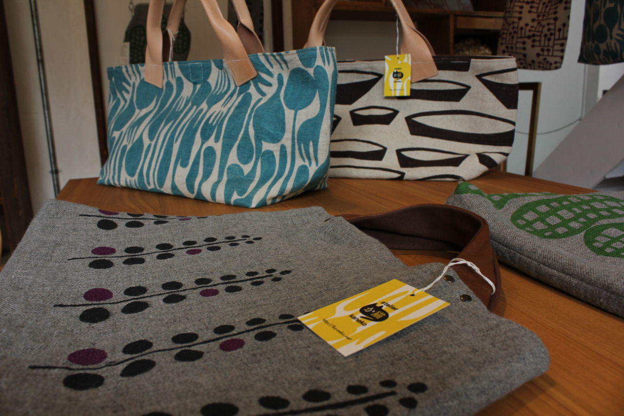 千葉の「アトリエか猫」さんのシルクスクリーンの布小物入っております。