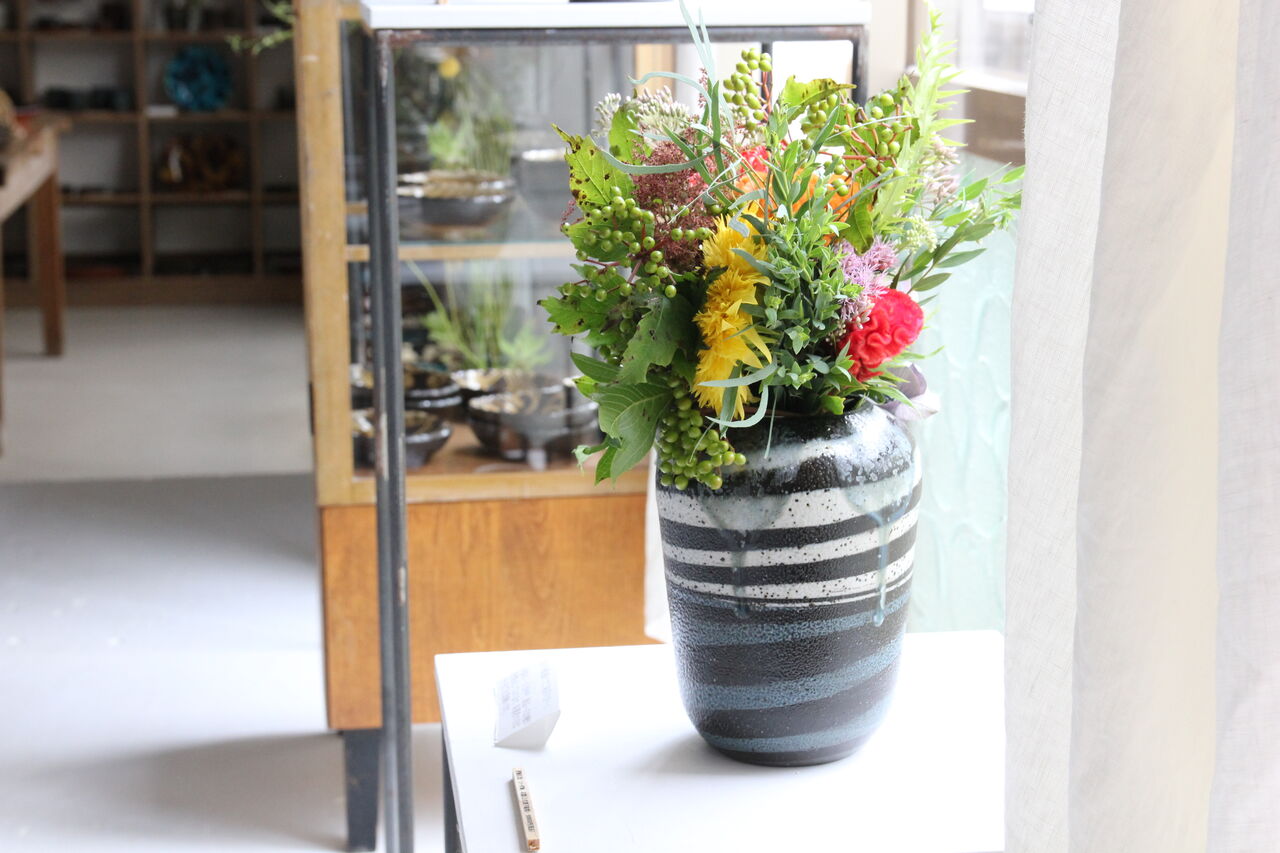 ソーダ窯の花器に様々の趣向で活けられています。