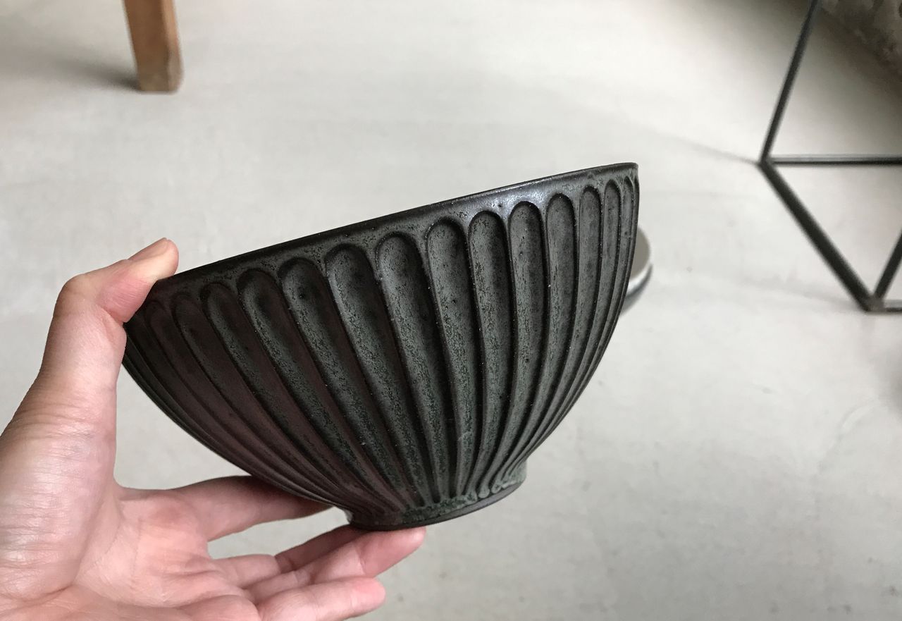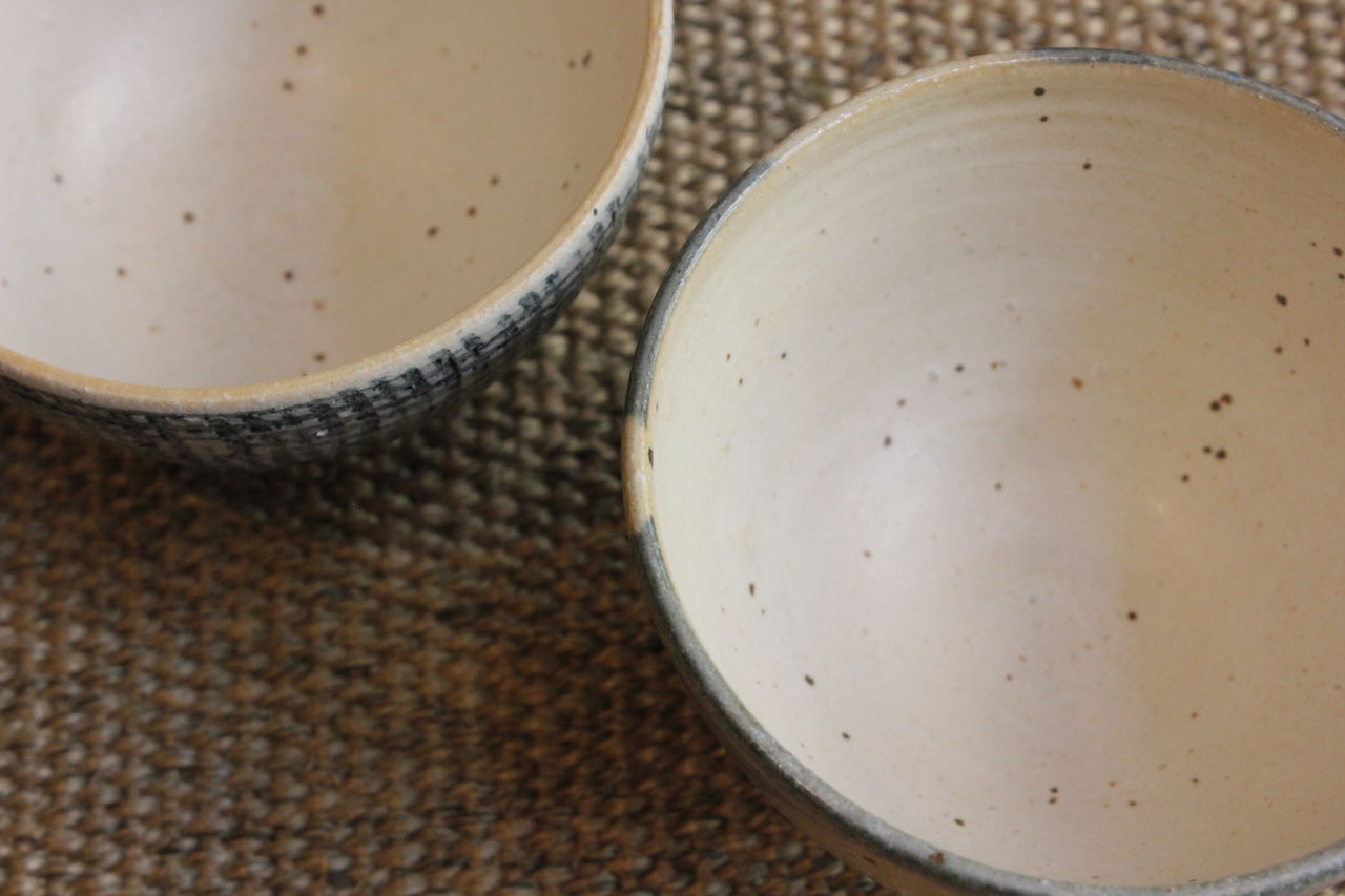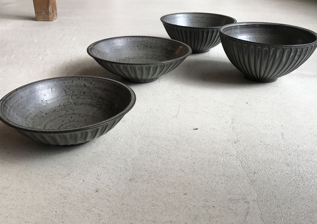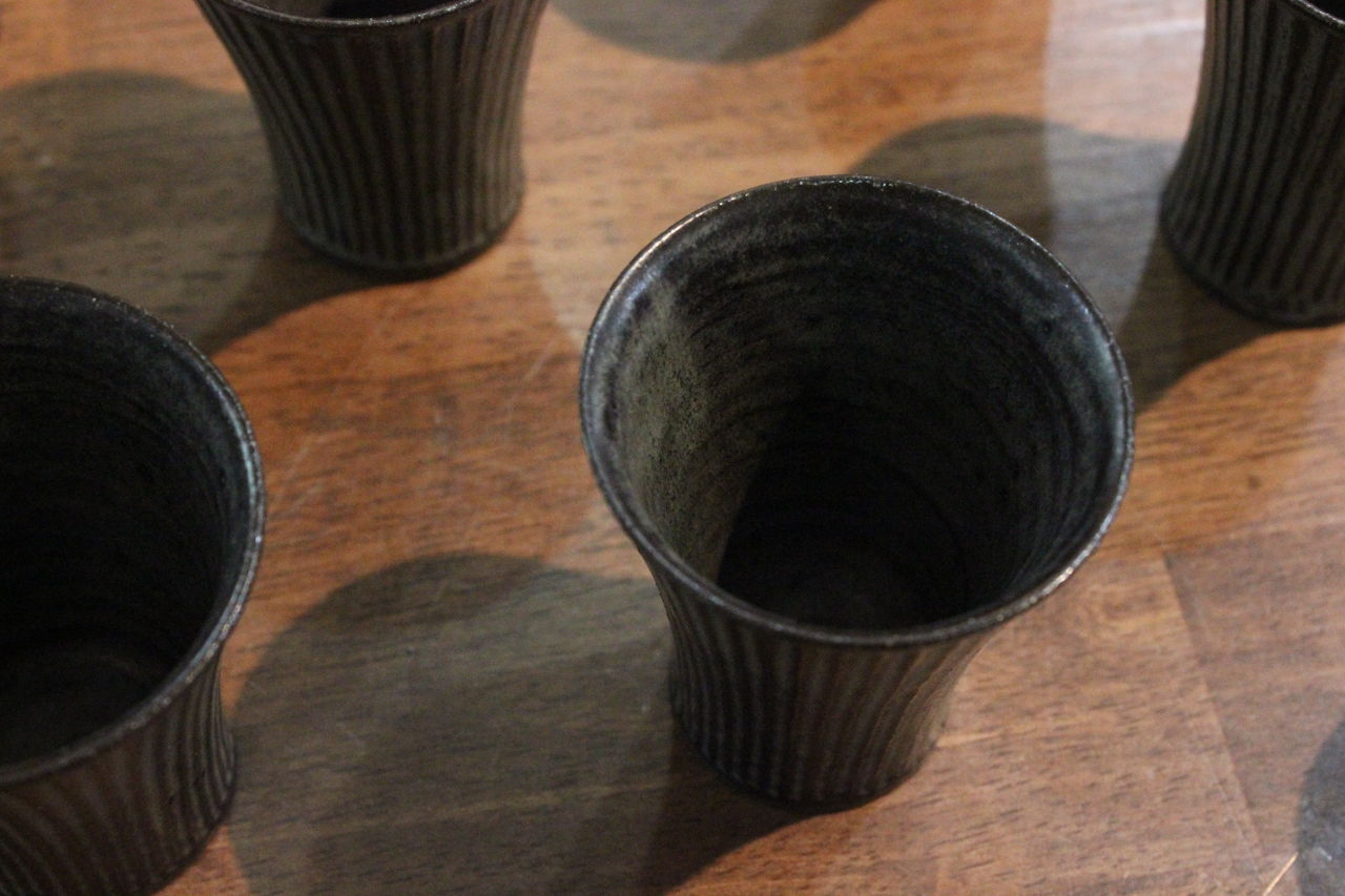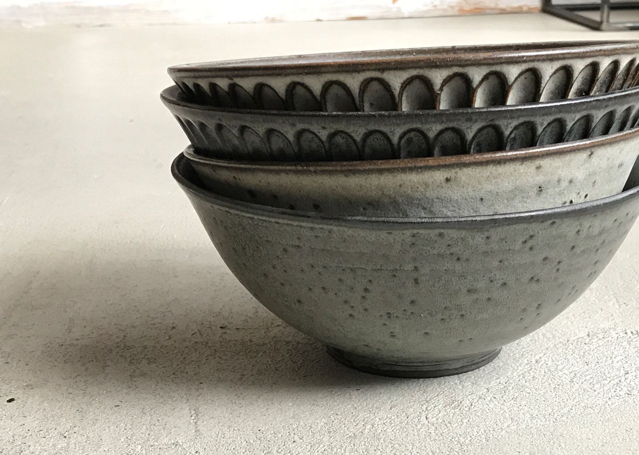 BBと名付けられたブルーブラックの釉薬に線彫りがほどこしてあり、陰影で柄が浮かび上がって見える器たち。いつも人気の形にももちろん搭乗しております!マグの大小はソーサーに合わせてもぴったり。合わせてご購入される方も多いです。飯碗はこの深い色がお米の白と艶を引き立ててくれます。そばちょこは和のフリーカップ。コーヒーにも小鉢にもデザートカップにも・・とイメージふくらみます。スタッキングもきれいにできますので、お客様用に数揃えされる方も多いアイテムです。