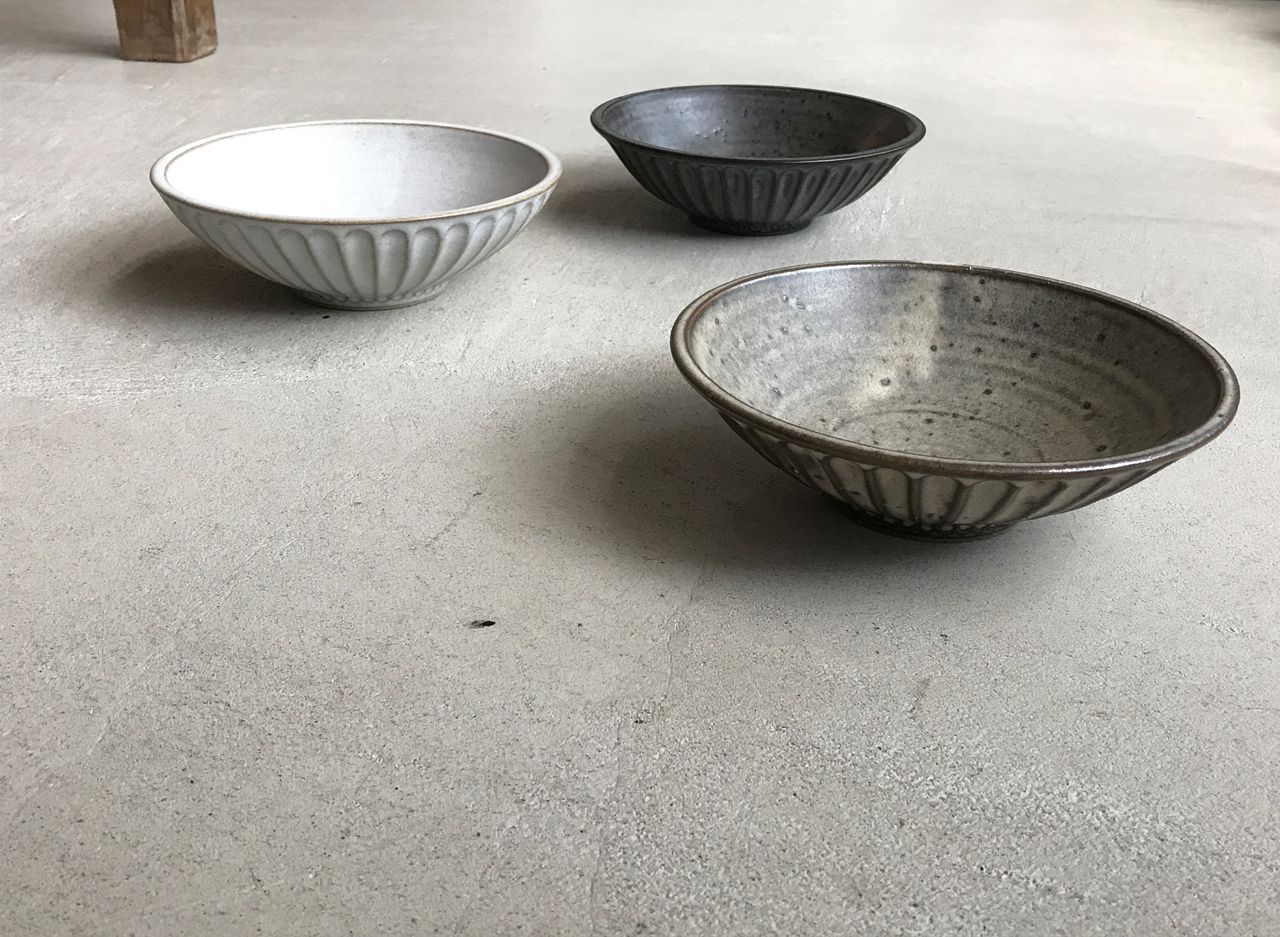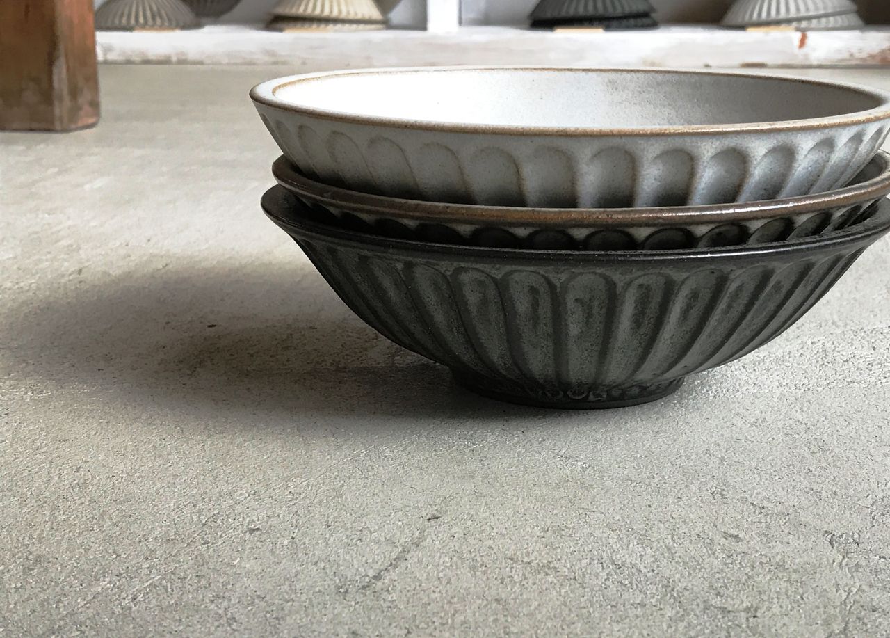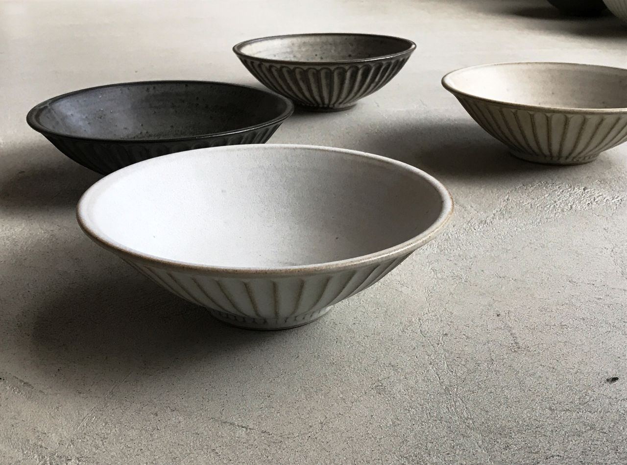 北岡さんの鉢、丼がバリエーション豊かになってます。種類は4種類。6寸鉢は鍋の取り鉢や煮物に。7寸鉢は副菜の盛り鉢や果物、そうめんチャンプルーなどに。どんぶりは見込みが広いのでうどん、親子丼、お芋の煮っころがしなど万能な形。ディープボウルはサラダや肉じゃが、野菜炒めをのっけたラーメンも余白をもって受け入れてくれます。