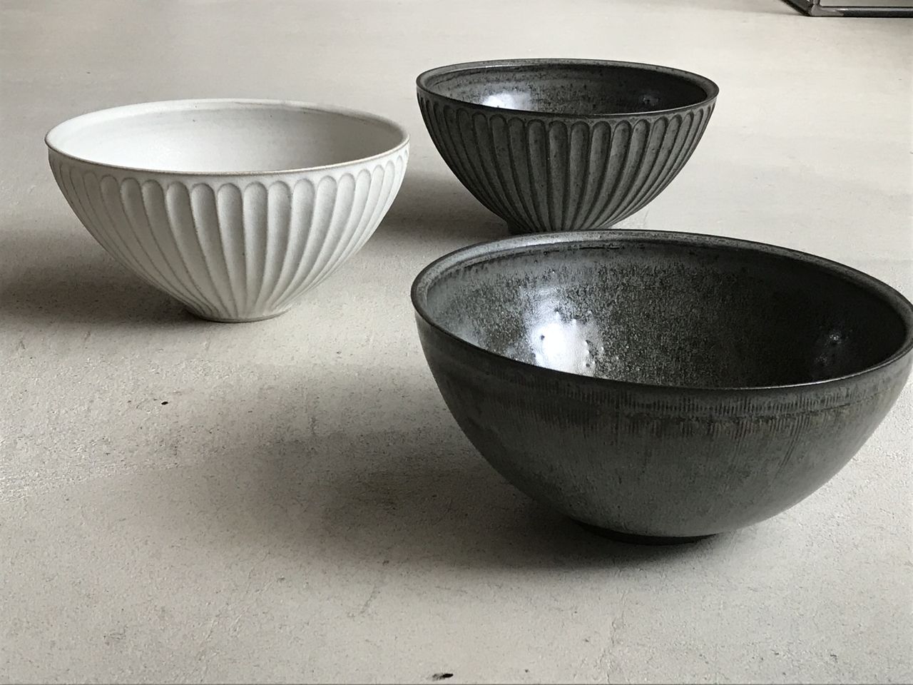 大きさの比較は並べているものをご参考になさってください。(手に持っているのは最初の灰白釉がどんぶり、BBがディープボウルです)