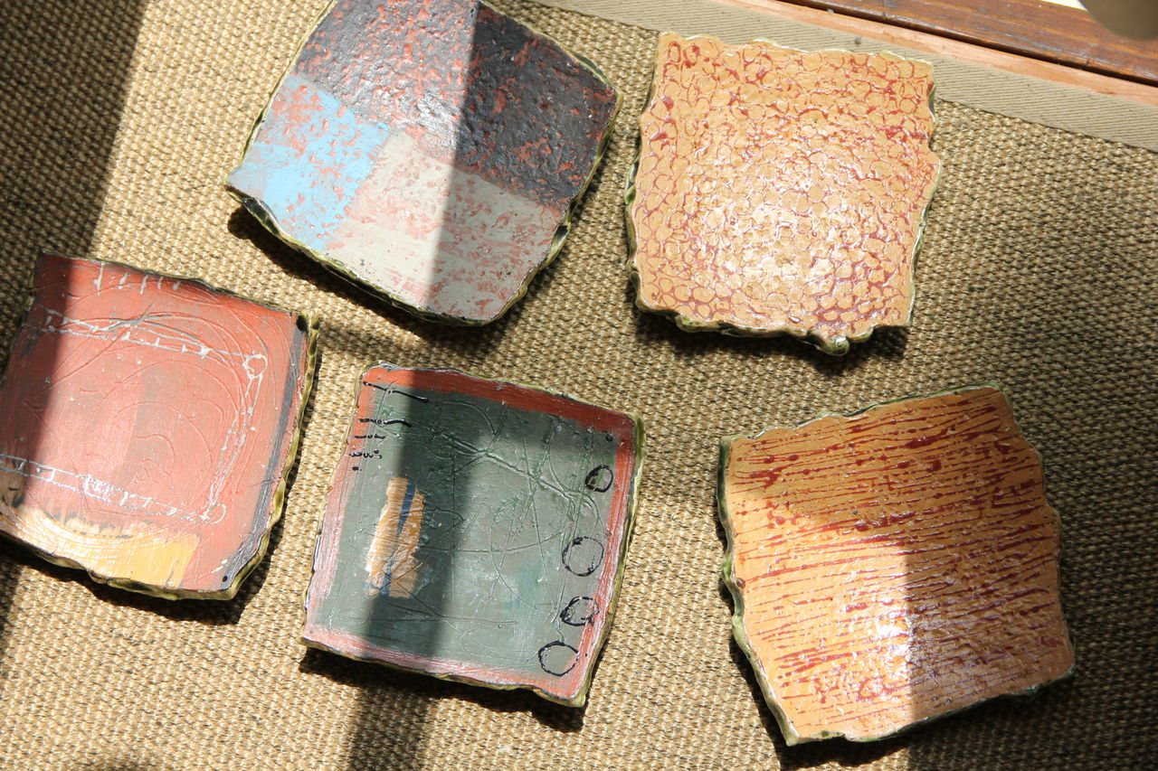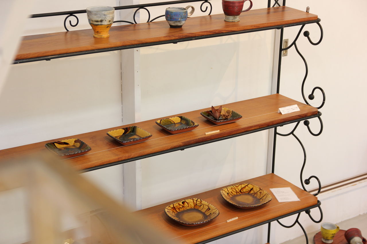 いつもの灰釉の作品に加え色泥彩のユニークで野趣に富んだ一点物の作品も。