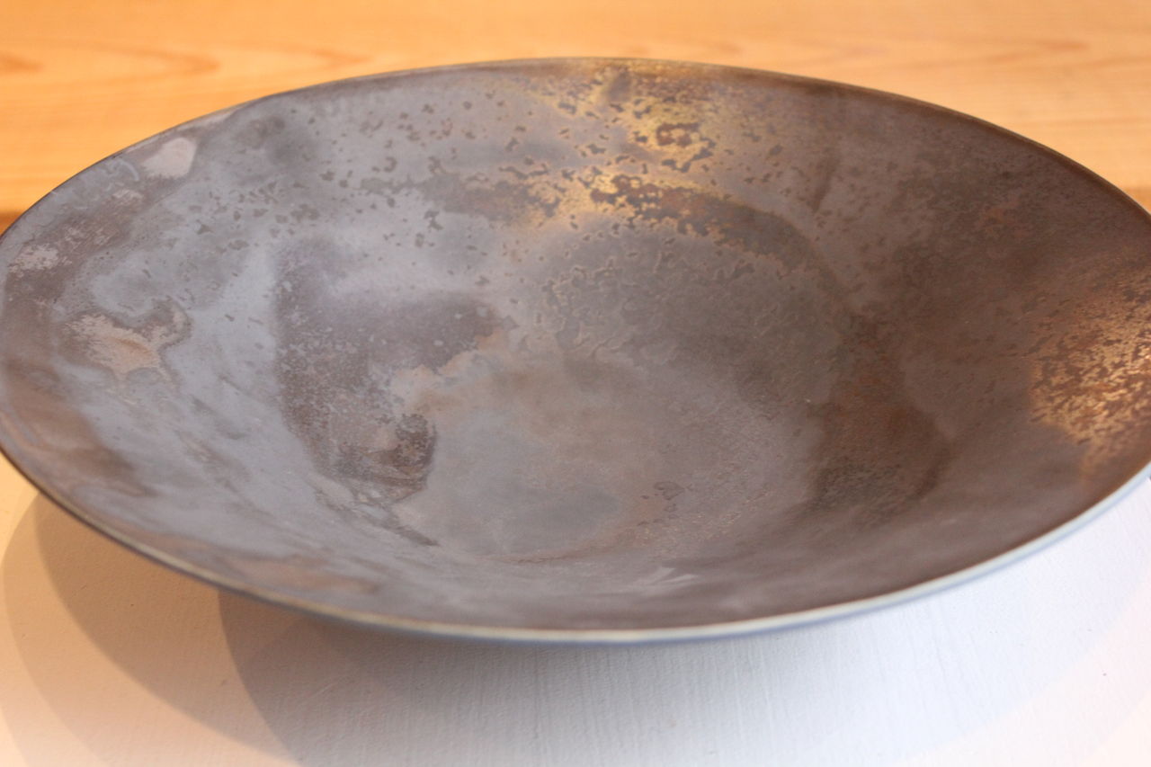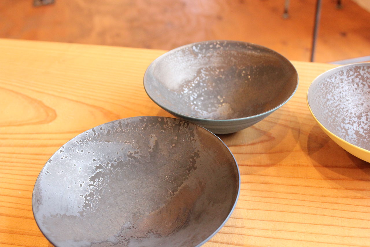 彼の真骨頂!!代名詞と言っていいパターンです。外側の色の遊びと、中の宇宙のような黒がカッコいい。お料理屋さんに絶大な人気を誇る盛り付けやすい器です!!