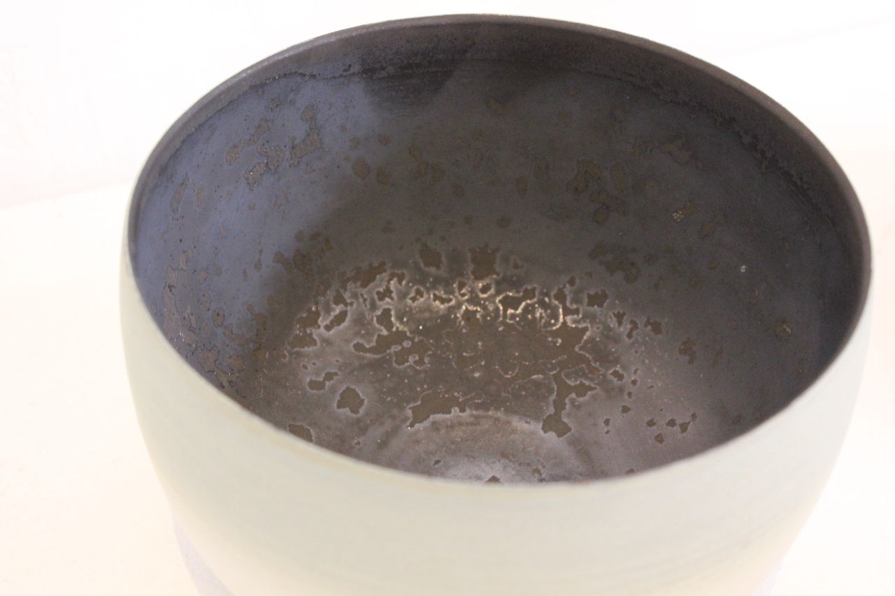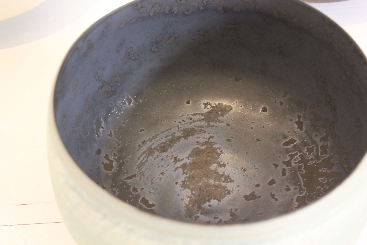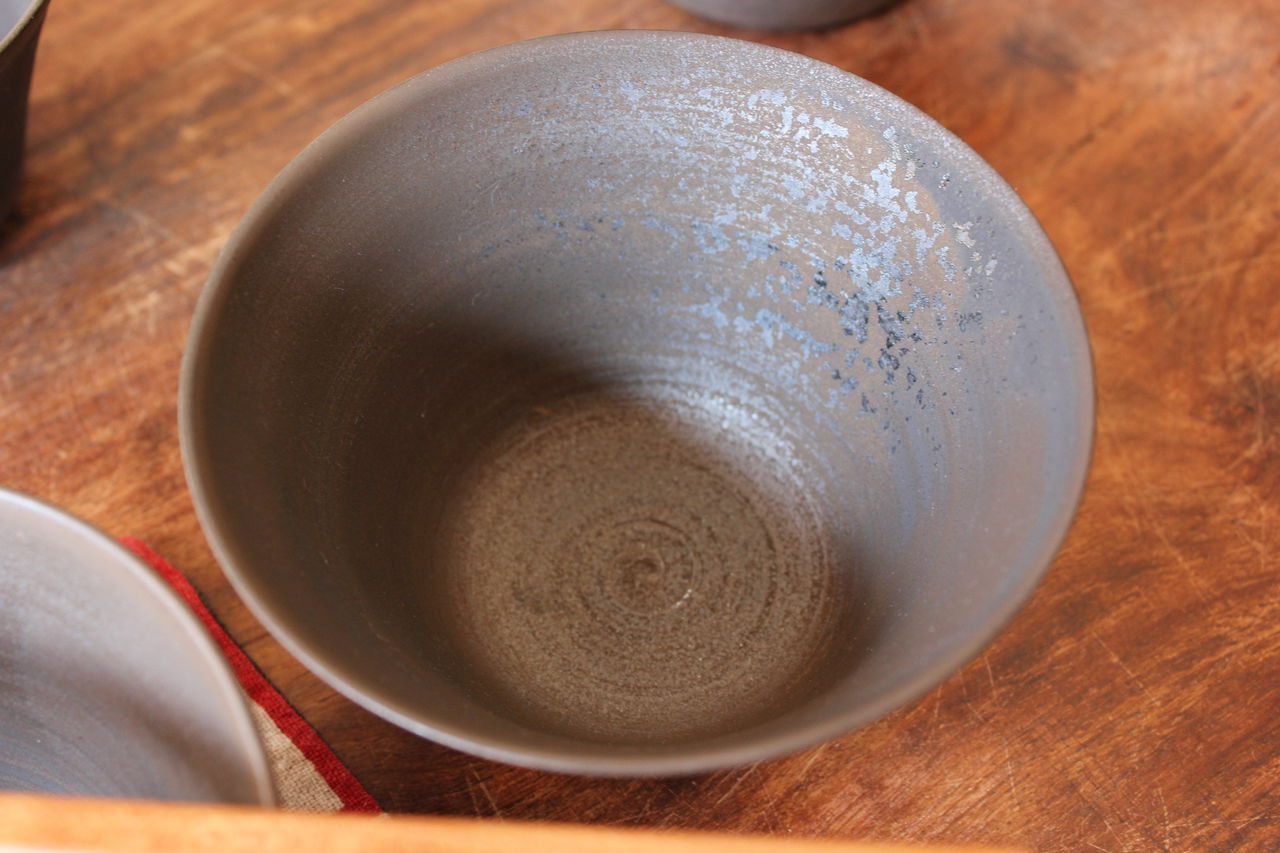 小さめの抹茶盌。作品レベルの器です。外に銀彩を施すと、中の天目調の黒の釉薬が反応し、