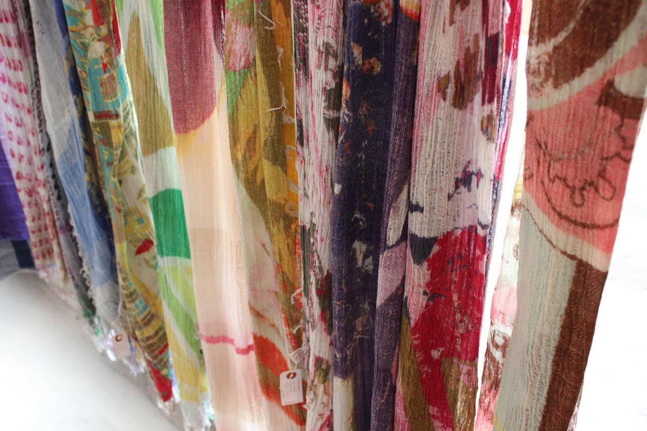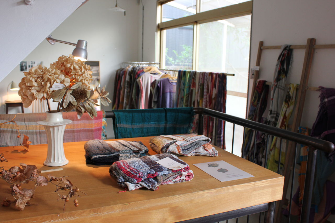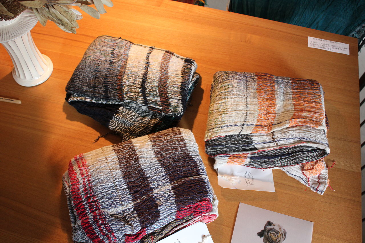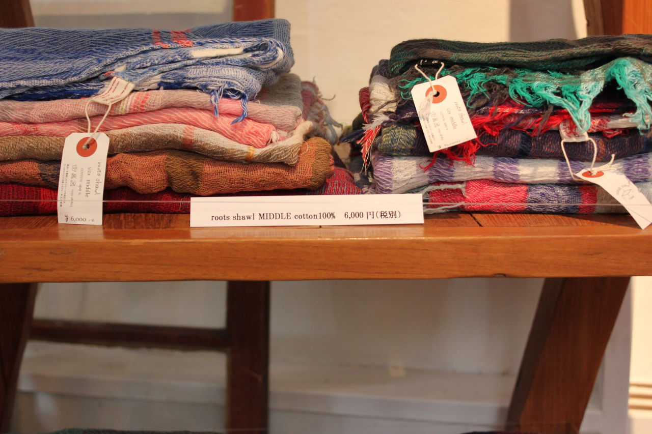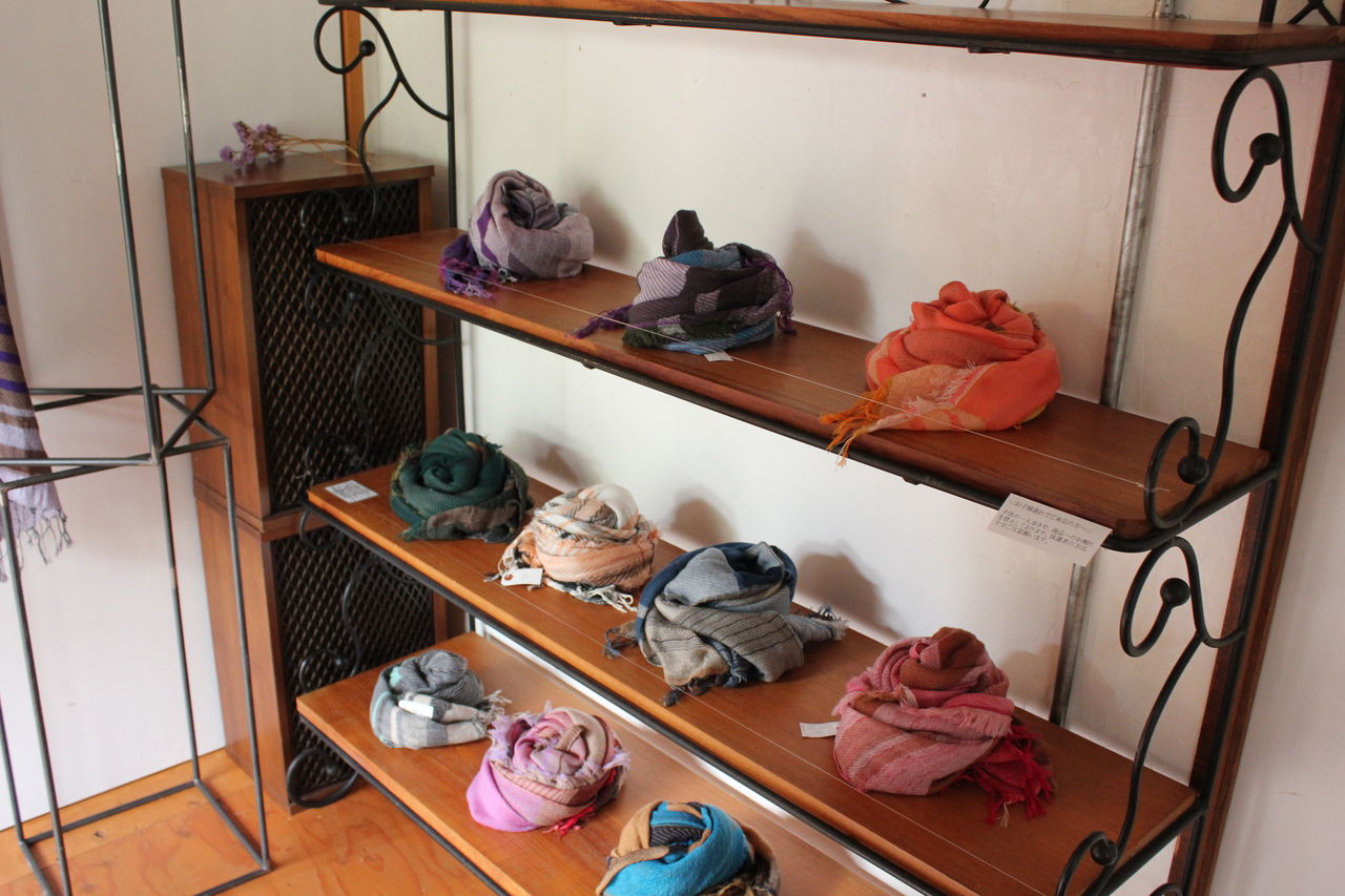 たくさんのバリエーションを見ていただきたくて大量に選んできましたが、見やすくディスプレイするのに一苦労。でも一点一点が素敵なので、ショールの良い香りに包まれつつ楽しんで準備することができました。