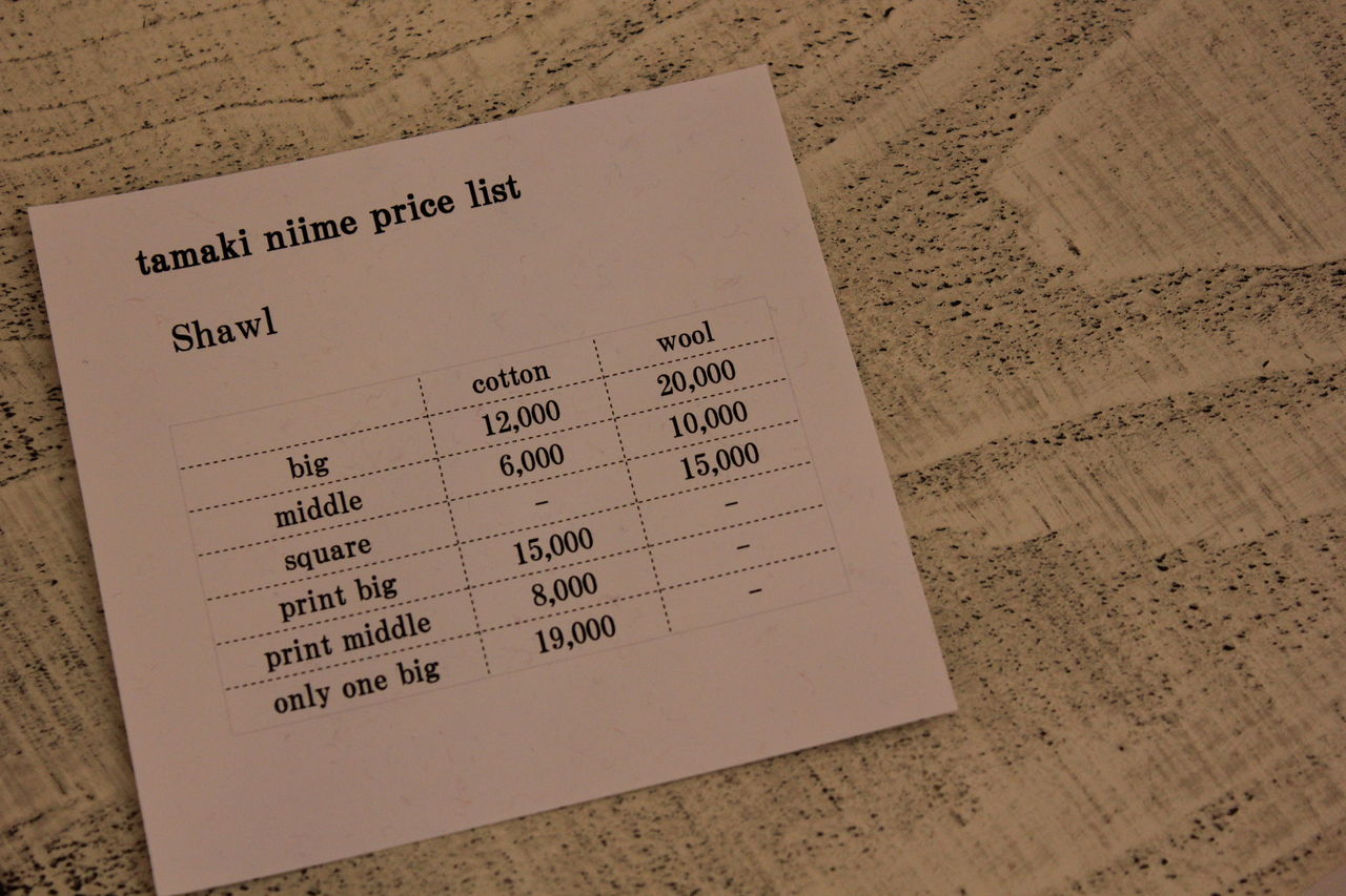 ショールのプライスリスト。手頃な価格設定で目移りします。