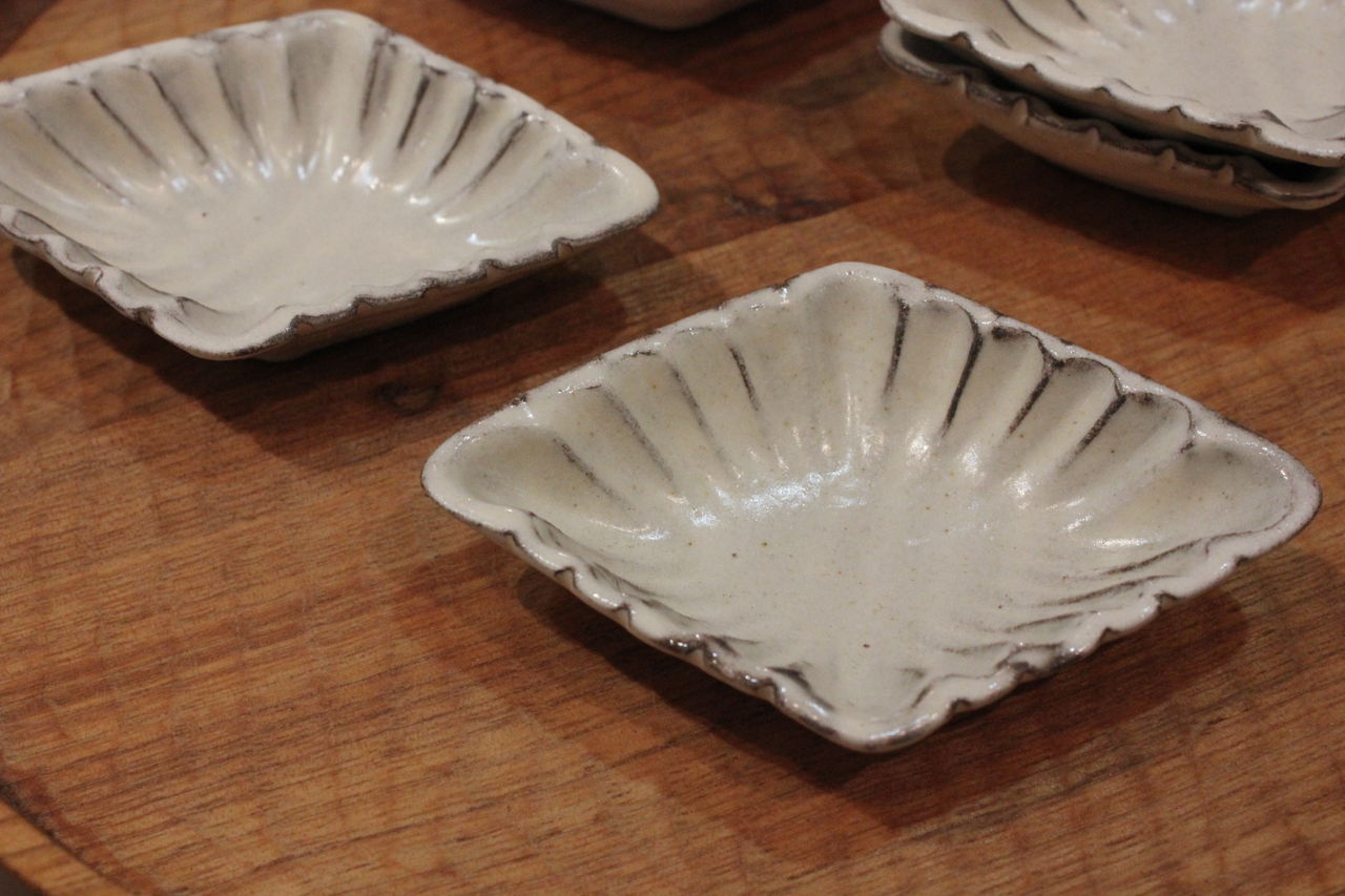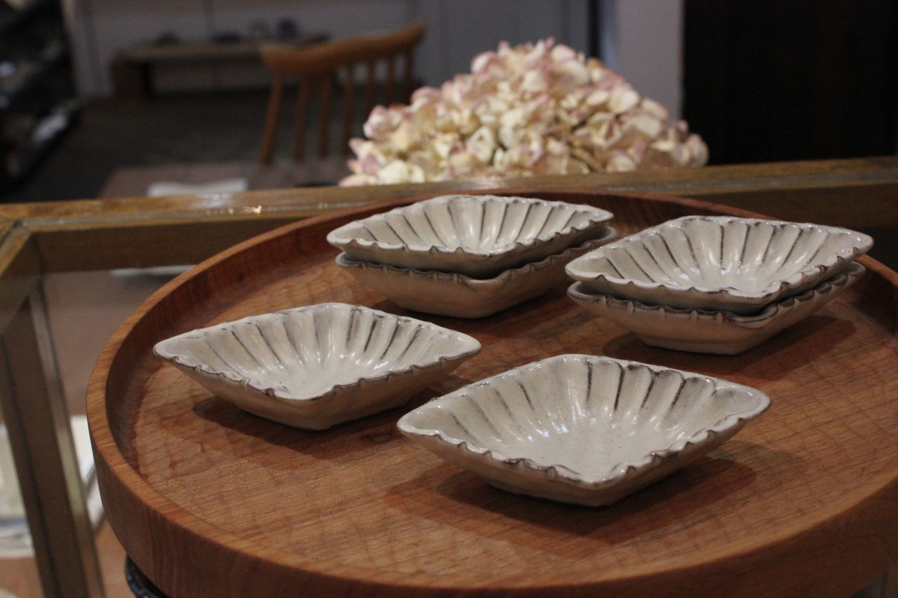 粉引しのぎ菱形小皿(Φ9.5×6.2h2) 1260円 可愛らしくもかっこよくもある名わき役!お醤油皿、角砂糖を入れて、ちょこっとお菓子皿、塩辛などの珍味、ディップ・・・使えて安くて絵になるええやっちゃ!!
