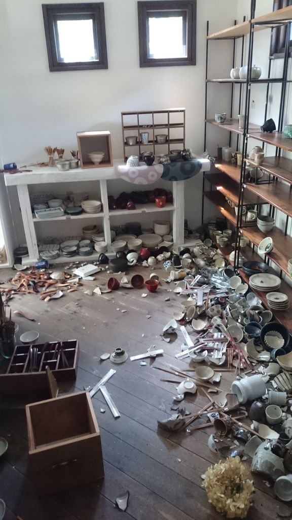 まさかの1日おいての2発目。数分は続いた震度6強の揺れ。夜中だったので混乱してしまいました。最初の地震で破損したものを一日かけて綺麗にしてしまって、あらたに陳列をしてしまったのが裏目に出てしまい、2発目でさらなる損害が出てしまいました。器は大きく破損。2発目の本震の方が大きく、自宅共にダメージが拡大、二日間車中泊避難となりました。